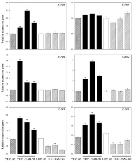 To investigate the spatial expression patterns of CsMLO1 and CsMLO2, we performed a qRT-PCR analysis of the tissue-specific expression patterns in different cucumber organs of susceptible and resistant cultivars (Figure S6). CsMLO1 exhibited the highest expression in the stem followed by the leaf, but it was weakly expressed in the cotyledon and root from the susceptible cultivar (Figure S6A). However, in the resistant cultivars, CsMLO1 was relatively highly expressed in the cotyledons and roots, followed by the leaves and stems (Figure S6B). In addition, CsMLO2 was significantly expressed in the leaf and cotyledon but was barely expressed in the stem and root from different cucumber organs of susceptible and resistant cultivars (Figure S6C,D). Therefore, the combined subcellular localization and spatial expression patterns indicated that CsMLO1 and CsMLO2 are both typical MLO proteins and exhibit tissue-specific expression.