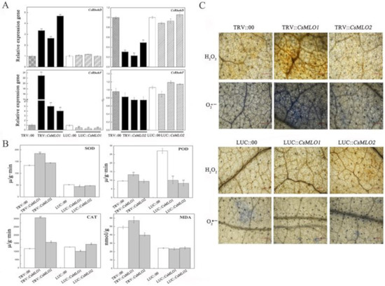 The above study demonstrated the involvement of CsMLO1 and CsMLO2 responses to exogenous H2O2 in cucumber. Next, we investigated whether the ROS formation-related genes were affected in CsMLO1 and CsMLO2 transient transgenic plants (Figure 9). The transcript levels of the CsRbohD (Cucsa.340760) and CsRbohF (Cucsa.107010) genes were significantly increased in CsMLO1-silenced plants and decreased in the CsMLO1-overexpressing plants compared to those of the controls. However, CsRbohD and CsRbohF expression declined in CsMLO2-silenced plants (Figure 9A). Thus, CsMLO1 silencing promoted ROS formation. To further verify these results, we examined antioxidant enzymes in CsMLO1 and CsMLO2 transient transgenic plants (Figure 9B). The activities of total superoxide dismutase (SOD), peroxidase (POD) and catalase (CAT) were higher in CsMLO1-silenced plants than in control plants but were lower in CsMLO1-overexpressing plants than control plants. Subsequently, excess ROS degraded polyunsaturated lipids to form malondialdehyde (MDA); the MDA level was significantly increased in CsMLO1-silenced plants, and opposite results were obtained in CsMLO1-overexpressing plants. However, the activities of these enzymes were decreased or unchanged in CsMLO2-transgenic plants and did not show a regular pattern. In addition, DAB and NBT staining was used to detect H2O2 and O2·− in CsMLO1 and CsMLO2 transgenic plants (Figure 9C). After CsMLO1 silencing, the H2O2 and O2·− levels were significantly increased, resulting in brown and blue spots that were more intense than those in the TRV:00 leaves, whereas the leaf color was not obviously changed in the CsMLO1-overexpressing plants compared with that in the LUC:00 plants. The DAB and NBT staining in all examined CsMLO2 transient transgenic cucumber cotyledon was similar to that of the TRV:00 and LUC:00 leaves. Based on these results, the clear signal pathways between CsMLO1 and ROS were further confirmed. The CsMLO1-silenced plants triggered ROS signaling in cucumber cotyledons as a defense response to C. cassiicola.