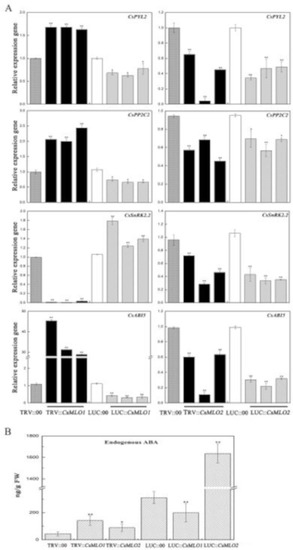 We investigated the expression patterns of CsMLO1 and CsMLO2 genes in response to plant hormones and abiotic stimuli. The transcript levels of CsMLO1 and CsMLO2 were observed under abiotic stimuli in the leaves of susceptible and resistant cultivars. To determine whether CsMLO1 and CsMLO2 were regulated by extracellular signals, we investigated the possible involvement of CsMLO1 and CsMLO2 in signaling pathways related to phytohormones and CaCl2. The expression characteristics of the CsMLO1 gene and the CsMLO2 gene were distinct in the resistant cultivar (Figure S7). Compared with those of the control plants, CsMLO1 and CsMLO2 showed different expression patterns after exogenous treatment with H2O2, ABA, SA, MeJA and CaCl2. The CsMLO1 transcript level was suppressed in resistant cultivars after treatment with exogenous ABA, CaCl2 and H2O2. CsMLO2 transcription was downregulated at 24 h and 48 h after treatment with exogenous H2O2, and CsMLO2 expression was distinctly induced and peaked at 12 h, followed by a downward trend in expression at 24 h and 48 h after treatment with exogenous CaCl2. But, CsMLO2 expression was upregulated after treatment with exogenous SA. Thus, these results indicated that CsMLO1 and CsMLO2 might be involved in ROS, ABA, SA and calcium signaling pathway.