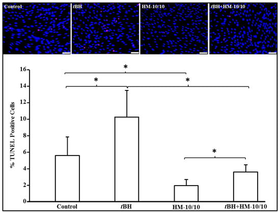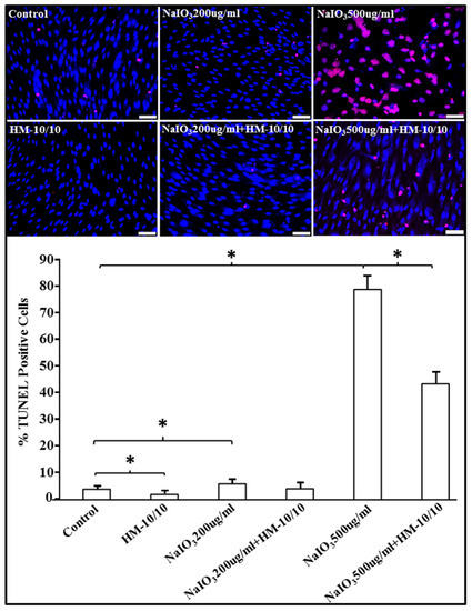 Early passage [2,3,4] primary cultured human fetal retinal pigment epithelial cells were cultured in 10% FBS DMEM medium [53]. Media was changed to 0.5% FBS DMEM the day before the treatment. Cells were treated with 200 uM tert-Butyl hydroperoxide (Sigma, St. Louis, MO, USA) or NaIO3 (200 μg/mL or 500 μg/mL) (Sigma, St. Louis, MO, USA) for 12 h or 24 h with or without the co-treatment of HM-10/10 at 10 μg/mL. hfRPE cells were cultured in glass bottom microwell dishes (MatTek, Ashland, MA, USA) and fixed in 4% paraformaldehyde solution and rinsed with PBS. Apoptotic cell death was measured using TUNEL assay according to the manufacturer′s instructions (Roche, Indianapolis, IN, USA). The number of TUNEL-positive cells was counted from eight different areas of each treatment under a fluorescent microscope and the average number of apoptotic cells was recorded. By using the IncuCyte live-cell analysis system (Essen BioScience, Ann Arbor, MI, USA), hfRPE cells were cultured in 96-well plates and imaged every hour up to 24 h after treatment to measure cell health and viability in real time. The data was analyzed by using the IncuCyte S3 software (Essen BioScience, Ann Arbor, MI, USA). Experiments were performed in quadruplicate; data were expressed as the mean of the quadruplicate determinations (mean ± SD).