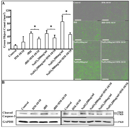 To further examine the apoptotic mechanism, we analyzed the activation of Caspase-3/7 in hfRPE cells using both the IncuCyte live imaging assay and Western Blot analysis (Figure 3). We used the IncuCyte® Caspase-3/7 Green Apoptosis Assay to determine the effect of HM-10/10 peptide on apoptosis in hfRPE cells. The green object counts of dead cells were increased when the cells were treated with either tBH or NaIO3 alone, but were significantly reduced when co-treated with HM-10/10 (p < 0.05) (Figure 3A). Western blot analysis showed cleaved Caspase-3 activation at 24 h was elevated in hfRPE cells treated with 200 μM tBH or NaIO3 alone, whereas co-treatment with HM-10/10 inhibited activation of Caspase-3 (Figure 3B).