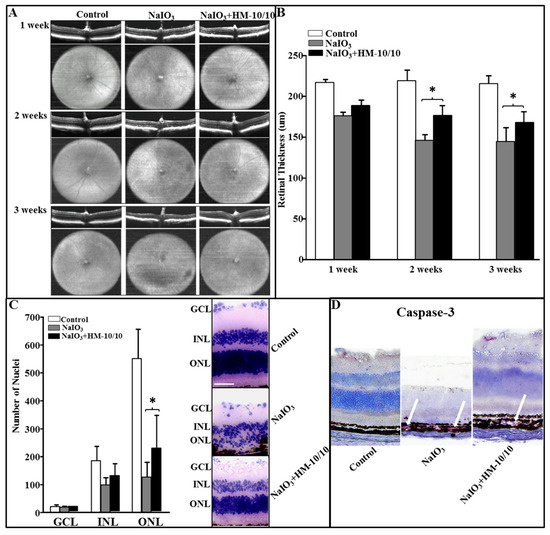 HM-10/10 treatment prevents degenerative changes in retina induced by intravenous NaIO3. Eye in vivo optical coherence tomography (OCT) images and the fundus photographs were taken after one, two, and three weeks of NaIO3 treatment as described under Materials and Methods. The mice were sacrificed at the end of three weeks. Retinal sections were scanned. (A) Degenerative changes shown by representative OCT and fundus images from Control, NaIO3, and NaIO3 + HM-10/10 groups of mice. Horizontal and vertical extents of fundus images are 1.4 × 1.4 mm, respectively. (B) Retinal thickness measurements from all three weeks of the study represented as bar graphs. (C) The numbers of nuclei were counted from each layer as described under Materials and Methods. The representative histopathology images showing decreased number of nuclei with NaIO3 treatment as compared to control and partial recovery in the number of nuclei with HM-10/10 treatment to that of control. Bar equals 50 μm. GCL: Ganglion cell layer; ONL: Outer nuclear layer; INL: Inner nuclear layer. (D) Immunohistochemistry staining of cleaved Caspase-3 (red) of retinal tissue sections. Bonferroni method was used to adjust the p < 0.0016 for multiple pairwise comparisons.