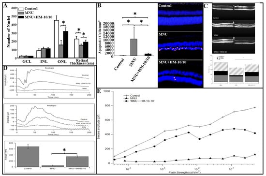 MNU solution at 5 mg/mL was prepared by dissolving reagent in physiological saline containing 0.05% acetic acid. The mice received a single intraperitoneal injection of MNU (Chem Service Inc., West Chester, PA, USA) at 60 mg/kg BW. Twelve mice were randomly assigned to three groups: (1) control group (Control): Mice received intraperitoneal (ip) injection of vehicle (physiological saline containing 0.05% acetic acid) and a standard chow; (2) MNU group (MNU): Mice received ip injection of MNU at 60 mg/kg BW and a standard chow; (3) MNU + HM-10/10 group (MNU + HM-10/10): Mice received ip injection of MNU at 60 mg/kg BW and fed with a diet containing HM-10/10 at 100 mg/kg BW added to chow. The mice received the regular chow or a chow containing HM-10/10 three days before MNU administration. On day five after MNU, SD-OCT images were taken and ERG function tests were analyzed. Eyes were enucleated, and frozen sections of retinal tissue were used for histology and TUNEL assay. Retinal sections were scanned, the numbers of nuclei were counted from each layer and retinal thickness was quantified.