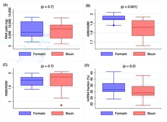 Box plot representing total RNA yield (A), RNA purity by A260/280 ratio (B), by A260/230 ratio (C), and isolated miRNA fraction (D) in matched formalin- and Bouin’s-fixed samples.