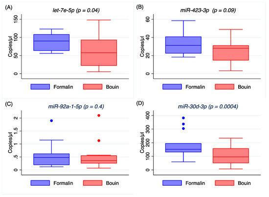 Box plot representing the quantitative reverse transcription polymerase chain reaction (RT/ddPCR) of let-7e-5p (A), miR-423-3p (B), miR-92a-1-5p (C), and miR-30d-5p (D) in matched formalin- and Bouin’s-fixed tissues by ddPCR. The box represents the first and third quartiles, intersected by the median, and the whiskers are the range.