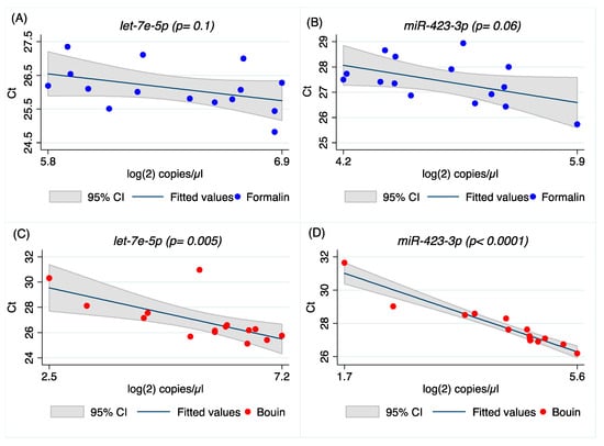 Scatter plot and linear prediction with 95% confidence interval of real-time and ddPCR results for let-7e-5p and miR-423-3p in formalin- (A,B) and Bouin’s-fixed tissues (C,D), respectively.