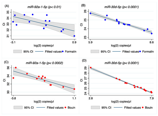Scatter plot and linear prediction with 95% confidence interval of real-time and ddPCR results for miR-92a-1-5p and miR-30d-5p in formalin- (A,B) and Bouin’s-fixed tissues (C,D), respectively.