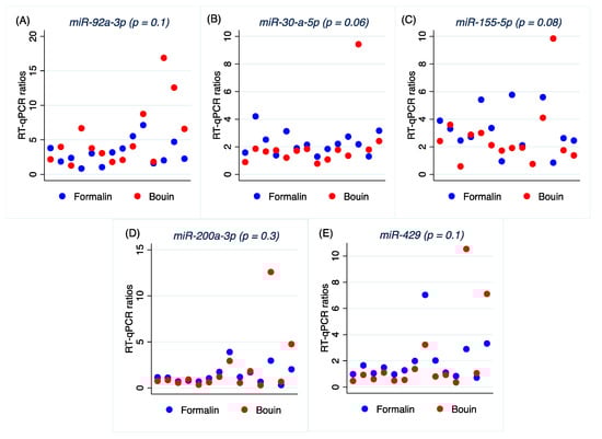 Scatter plot of real-time RT-qPCR ratios for miR-92a-1-5p (A), miR-30d-5p (B), miR-155-5p (C), miR-200a-3p (D), and miR-429 (E) in formalin- and Bouin’s-fixed tissues.