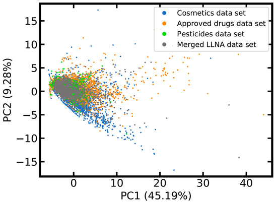 Whereas only few of the cosmetics, approved drugs and pesticides listed in the reference data sets are included in the LLNA data sets, principal component analysis (PCA) shows that the areas in chemical space most densely populated with these xenobiotics are actually well-covered by the merged LLNA data set (Figure 1). Nevertheless, scattered data points radiating from the area of high data density towards the bottom and the top right corner of the PCA score plot indicate the existence of drugs and cosmetic compounds without closely related substances listed in the merged data set.