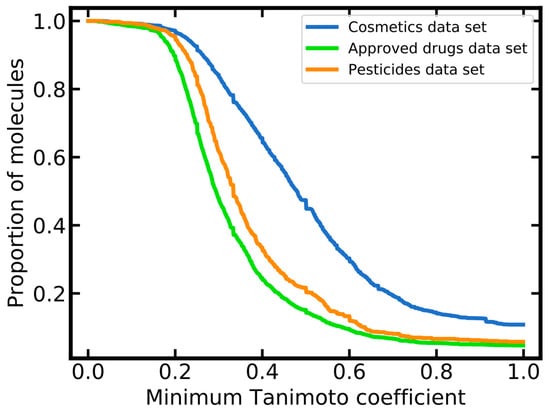 In addition to PCA analysis, the coverage of cosmetics, approved drugs and pesticides by the merged LLNA data set was quantified based on the distribution of maximum pairwise similarities. As shown in Figure 2, the merged LLNA data set covers cosmetics much better than approved drugs and pesticides: over 30% of all cosmetics are represented by the respective nearest neighbor in the merged LLNA data set with a minimum Tanimoto coefficient of 0.6, whereas this is the case for only 10% and 13% of all approved drugs and pesticides, respectively.