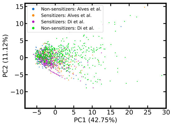 Score plot comparing the chemical space of compounds of the local lymph node assay (LLNA) data sets of Alves et al. and Di et al. The score plot was derived from a PCA based on the identical setup described in the caption of Figure 1. Two data points are located outside the displayed intervals.