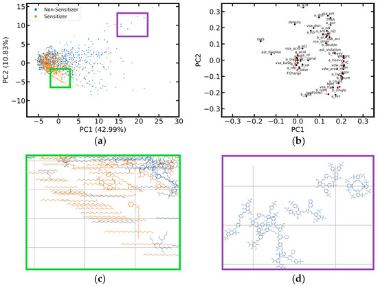Principal component analysis (PCA) of the physicochemical properties of skin sensitizers and non-sensitizers included in the merged local lymph node assay (LLNA) data set. The PCA is based on the identical setup described in the caption of Figure 1. (a) Score plot, with the percentage of variance explained by the individual principal components reported as part of the axis labels. Two data points are located outside the displayed intervals. (b) Loadings plot (an enlarged version is provided in Figure S1; the abbreviations of the individual molecular descriptors are explained in Table S1). (c) Detailed view of the lower left region of the score plot, where mainly sensitizers are observed to form a line of data points. These sensitizers are aliphatic, monohalogenated hydrocarbons that differ primarily by chain length and halogen atom type. (d) Detailed view of the upper right part of the score plot, where mainly non-sensitizing compounds are located, characterized by high molecular weight, aromaticity and a large topological polar surface area.