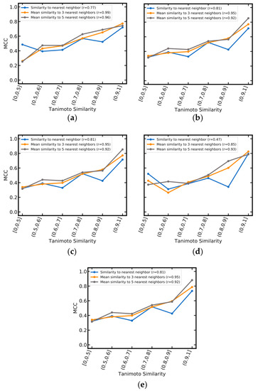 Matthews correlation coefficient (MCC) as a function of molecular similarity between the query compounds and the one, three and five nearest neighbors in the training data (calculated as averaged Tanimoto coefficients based on MACCS fingerprints). (a) SVM_MOE2D+OASIS; (b) SVM_PaDEL+OASIS; (c) SVM_PaDEL; (d) RF_MACCS; (e) SVM_PaDEL+MACCS. Pearson correlation coefficients are reported in brackets in the figure legends. The number of compounds in each bin is summarized in Table S7.
