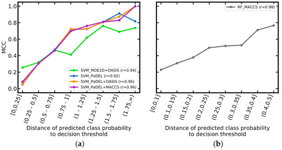 Matthews correlation coefficient (MCC) as a function of the distance between the predicted class probabilities and the decision thresholds, for the (a) support vector machine (SVM) models and (b) random forest (RF) model. The number of compounds in each bin is summarized in Table S8.