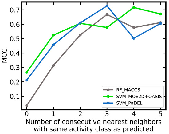 As a further way of analyzing the data, we looked into the reliability of predictions as a function of the number of consecutive nearest neighbors in the training data that are of the same activity class as the one predicted for a compound of interest. From Figure 9, it can be seen that predictions are particularly reliable if the three nearest neighbors in the training data are of the identical class as the class predicted for a compound of interest. The strongest correlation is observed for the RF_MACCS model. For this model the MCC is close to zero for compounds where the predicted class is in conflict with the class assigned to the nearest neighbor. In contrast, the MCC is above 0.6 for compounds where the predicted class and the classes assigned to the three nearest neighbors are identical.