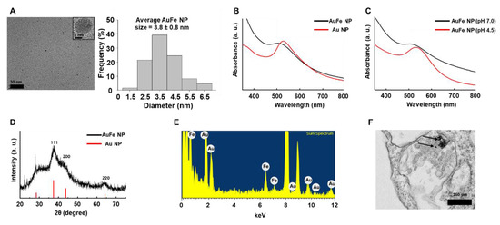 (A) Transmission electron microscopy (TEM) image of AuFe NPs (left) with size distribution (right). UV-Vis spectra of AuFe NPs with Au NPs at (B) neutral pH 7.0 and (C) pH 4.5. Black line indicates AuFe NP and red line indicates Au NP. (D) Powder X-ray diffraction (XRD) patterns of AuFe NPs and Au NPs. (E) Energy-dispersive X-ray spectroscopy (EDS) spectrum of AuFe NPs. (F) TEM image of an hMSC with AuFe NPs (black arrows: AuFe NPs in hMSC, scale bar represents 250 μm).