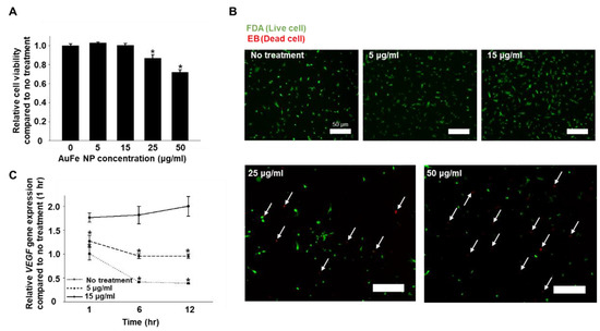 (A) Cytotoxicity test performed on hMSCs, 24 h after treatment with various concentrations of AuFe NP (0, 5, 15, 25, and 50 μg/mL) (n = 4, * p < 0.05 compared to no treatment). (B) FDA/EB assay to measure hMSC viability, 24 h after treatment with various concentrations of AuFe NP. Live cells are stained in green and dead cells (white arrows) are stained in red. Scale bars represent 50 μm. (C) Relative mRNA expression of VEGF in hMSCs treated with various concentrations of AuFe NP for 1, 6, and 12 h, as evaluated by qRT-PCR (n = 4, * p < 0.05 versus AuFe NPs 15 μg/mL group).