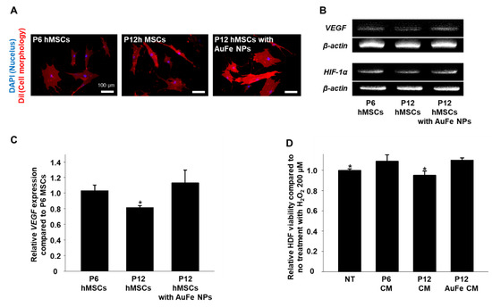 (A) DiI staining (blue: nucleus, red: cellular membrane) of hMSCs with low passage (P6) without NP treatment, hMSCs with high passage (P12) without AuFe NP treatment, and hMSCs with high passage (P12) with AuFe NP treatment. (B) VEGF and HIF-1α expression in P6 hMSCs without NP treatment and P12 hMSCs without or with AuFe NP treatment, as evaluated by RT-PCR. (C) Relative VEGF expression in P12 hMSCs without or with AuFe NP treatment, with respect to that in P6 hMSCs without NP treatment (n = 4, * p < 0.05 versus P12 hMSCs with AuFe NPs group). (D) Relative cell viability of human dermal fibroblasts (HDFs) cultured using CM collected from NT; Fresh medium, P6 CM; P6 hMSCs without NP treatment, P12 CM; P12 hMSCs without NP treatment, and P12 AuFe CM; P12 hMSCs with NP treatment under hypoxic cinditions (H2O2, 200 μM) (n = 4, * p < 0.05 versus P12 AuFe CM group).