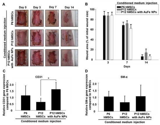 The CM collected from cultures of P6 hMSCs, P12 hMSCs, and AuFe NP-treated P12 hMSCs, were injected into mice models of skin wounds. Figure 4C depicts that AuFe NP-treated P12 hMSCs exhibit significantly increased CD31 expression compared to the P12 hMSCs without treatment; however, no significant difference was observed among various cell groups with respect to wound closing at 14 days after the treatment (Figure 4A,B). As illustrated in Figure 4D, SM-α expression did not exhibit any significant difference among various cell groups.