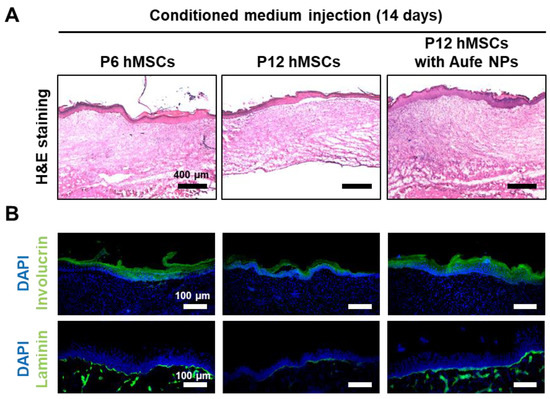 Unique tissue layers, which can be found in the normal skin tissue were partially detected in CM collected from P6 hMSCs and AuFe NP-treated P12 hMSCs (Figure 5A). Due to the presence of involucrin and laminin positive signals at the wound sites, regeneration of the epidermis and basal layers in P6 hMSCs and AuFe NP-treated P12 hMSCs were relatively enhanced compared to those of P12 hMSCs group [35]. According to the in vivo data (qRT-PCR, wound closing ratio, and tissue staining), the appearance of wound sites revealed no significant difference at 14 days after the treatment among the three groups; however, the relative amount of involucrin and laminin positive signals increased in P6 hMSCs and AuFe NP-treated P12 hMSC compared to P12 hMSCs without treatment, which indicates improved internal tissue regeneration in the wound sites compared to P12 hMSCs without treatment.