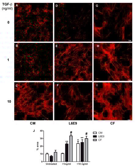 Transforming growth factor beta (TGF-β) differentially modulates fibronectin (FN) in cardiomyocytes, skeletal myoblasts L6E9, and cardiac fibroblasts. (A) Normal cardiomyocytes showed FN fibrils on surface. The addition of 1 ng/mL of TGF-β (B) did not alter the FN expression in normal cardiomyocytes. Only 10 ng/mL of TGF-β induced the increase of FN expression (C). In contrast, L6E9 skeletal myoblasts (E) and cardiac fibroblasts (H) presented the FN matrix stimulation after treatment with 1 ng/mL TGF-β when compared to untreated cultures (D,G). The FN increase was still detected in these two cell types with addition of 10 ng/mL (F,I) of TGF-β. (J) FN staining area was measured with Image J software, showing the thickening of FN fibrils after TGF-β treatment. * p ≤ 0.05 compared to untreated cardiomyocytes (CM); ** p ≤ 0.05 compared to untreated L6E9; # p ≤ 0.05 compared to untreated cardiac fibroblasts (CF). Bar = 20 μm.