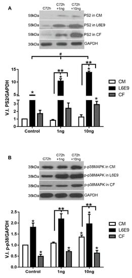 Phosphorylated SMAD2 and p38 MAPK detection in normal cultures. (A) Comparison of SMAD2 phosphorylation (PS2) detection of CM, L6E9 skeletal myoblasts, and CF treated with TGF-β (1–10 ng/mL) per 1 h. PS2 basal levels in L6E9 skeletal myoblasts and CF were significantly greater than CM. After the addition of TGF-β, PS2 remained significantly higher in L6E9 and CF relative to CM. L6E9 skeletal myoblasts responded to TGF-β stimulus in a dose dependent manner. CF showed a slight level of PS2 increase. * p ≤ 0.05 compared to CM; ** p ≤ 0.05 compared with CM in a different concentration; # p ≤ 0.05 compared with L6E9 control. N = 3; (B) Comparison of phosho-p38 MAPK detection of CM, L6E9 skeletal myoblasts, and CF treated with TGF-β (1–10ng/mL) per 1 h. L6E9 skeletal myoblasts presented a high level of p38 MAPK phosphorylation when compared with CM. When CM was compared with CF, a higher p38 MAPK phosphorylation after stimulation with TGF-β (1–10 ng/mL) was observed. * p ≤ 0.05 compared to CM and ** p ≤ 0.05 compared with CM in a different concentration. N = 3.