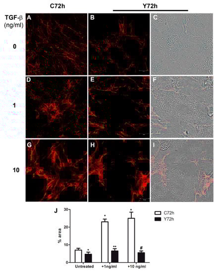 Distribution of fibronectin in L6E9 skeletal myoblasts infected with T. cruzi and treated with TGF-β. T. cruzi infection (72 h) reduced FN fibrils staining (red) in L6E9 skeletal myoblasts (B,C) when compared to uninfected controls (A). The treatment of T. cruzi infected L6E9 skeletal myoblasts with 1 ng/mL (E,F) or 10 ng/mL (H,I) of TGF-β induced an increase in FN expression only in uninfected areas in this culture when compared to uninfected TGF-β treated cultures ((D) 1 ng/mL; (G) 10 ng/mL), which presented widespread enhancement of FN. (J) Measurement of FN staining area with Image J software showed a reduction of the FN area after infection and a thickening of FN fibrils after TGF-β treatment in uninfected cultures. Differential interference contrast (DIC) was used to show the intracellular parasites in the host cells. * p ≤ 0.05 vs. untreated, uninfected control (C72h); ** p ≤ 0.05 vs. uninfected + 1 ng/mL TGF-β; # p ≤ 0.05 vs. uninfected + 10 ng/mL TGF-β. Bar = 20 μm.