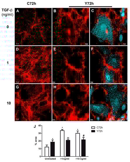 Distribution of fibronectin in cardiac fibroblasts infected with T. cruzi and treated with TGF-β. FN staining (red) in untreated T. cruzi infected CF (B,C) showed a general intensification of FN expression after 72 h of interaction, while highly infected cells presented a localized reduction when compared to uninfected controls (A). CF cultures showed higher FN expression after treatment with 1 ng/mL (D) and 10 ng/mL (G) of TGF-β. CF still displayed a localized reduction of FN staining in infected cells, even after TGF-β treatment ((E,F) 1 ng/mL; (H,I) 10 ng/mL). (J) Quantification of FN fibril thickness by image processing with Image J software. DAPI (blue) was used to label the nucleus of the host cell and the kinetoplast of intracellular parasites. * p ≤ 0.05 vs. untreated, uninfected control (C72h); ** p ≤ 0.05 vs. uninfected + 1 ng/mL TGF-β; # p ≤ 0.05 vs. uninfected + 10 ng/mL TGF-β. Bar = 20 μm.