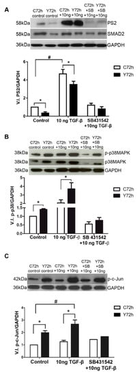 PS2, phospho-p38 MAPK, and phospho-c-Jun detection in normal and infected cardiac fibroblasts with T. cruzi. (A) PS2 detection. Normal CF showed an increase of SMAD2 phosphorylation when treated with 10 ng/mL of TGF-β. Infected CF were unable to trigger the classical signaling pathway, even when treated with 10 ng/mL, compared to the uninfected pair. The SB431542 inhibitor prevented SMAD2 phosphorylation in CF cultures after stimulation with TGF-β. (B) Phosphorylated p38 MAPK detection. In normal CF treated with 10 ng/mL of TGF-β, an increase of p38 MAPK phosphorylation detection was observed. T. cruzi infection did not result in significant differences in p38 MAPK phosphorylation, although there was a tendency to increase in this signaling pathway. After addition of 10 ng/mL of TGF-β, the signaling pathway was triggered in CF. The inhibitor SB431542 prevented the p38 MAPK phosphorylation in both normal and infected CF treated with 10 ng/mL TGF-β. (C) Phosphorylated c-Jun detection. Note that infection by T. cruzi led to an increase in the c-Jun signaling pathway. The addition of TGF-β in normal cultures resulted in a 25% increase in c-Jun detection. The increase triggered by the infection remained and was enhanced by treatment with TGF-β. In all panels, white bars correspond to control, uninfected cultures (C72h), while black bars depict levels of T. cruzi (Y strain) infected cultures (Y72h). * p ≤ 0.05 compared their control pairs; # p ≤ 0.05 compared to untreated, uninfected controls N = 3.