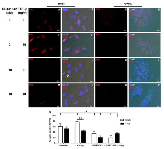 Phosphorylated SMAD2 detection in Trypanosoma cruzi infected cardiac fibroblasts. PS2 staining is represented in red (A,C,E,G,I,K,M,O), while cell nuclei are depicted in blue after DAPI staining together with DIC (B,D,F,H,J,L,N,P). (A,B) Control, uninfected cultures (C72h), showing constitutive PS2 expression; (C,D) T. cruzi infection (72h- Y72h) reduced PS2 detection (Y72h); (E,F) TGF-β treatment stimulated PS2 in uninfected cultures; (G,H) Infection with T. cruzi prevented PS2 signaling in CF; SB431542 inhibited PS2 detection in uninfected (I,J) and T. cruzi infected (K,L) CF cultures; (M,N) SB431542 prevented TGF-β stimulation of PS2; (O,P) T. cruzi infection and SB431542 treatment resulted in low detection of PS2 in CF. (Q) Quantification of percentage of nuclei positive for PS2. * p ≤ 0.05 vs. untreated, uninfected control; ** p ≤ 0.05 vs. C72h + 10 ng/mL TGF-β. Bar = 10 μm.