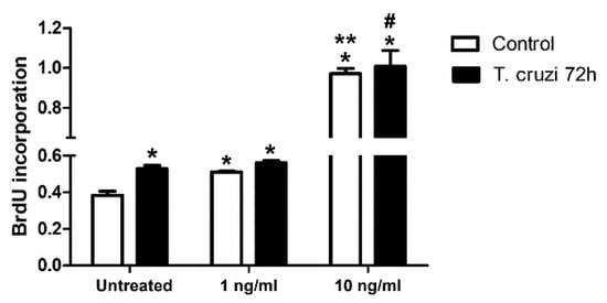 CFs plated in a density of 1.5 × 104 cells per well in 96-well plates were infected with T. cruzi (Y strain, 10 parasites/host cell), and after 24 h of infection, the cultures were treated with 1, 5, and 10 ng/mL of TGF-β per 48 h. Measurement of proliferation of CFs was performed using BrdU Cell Proliferation Kit (Millipore) according to manufacturer’s instructions. Briefly, after 48 h of treatment with TGF- β and 72 h of T. cruzi infection, the cultures were incubated with 20 µg/mL of 5-bromo-2′-deoxiuridin (BrdU), allowing its incorporation in proliferating cells for 2 h. Cells were fixed, and the DNA was denatured with the solution provided by the kit for 30 min at room temperature. After washing, the BrdU-labeled DNA was detected by the monoclonal anti-BrdU antibody for 1 h at room temperature. The plate was washed, and the antigen–antibody complex was revealed by addition of peroxidase-conjugate goat anti-mouse IgG, antibody, and 3,3′,5,5′-Tetramethylbenzidine (TMB) as peroxidase substrate. The reaction was stopped with acid Stop Solution, and the colorimetric reaction was read in an M2 Spectramax Plate Reader (Molecular Devices, San Jose, CA, USA) at λ450 nm.