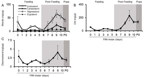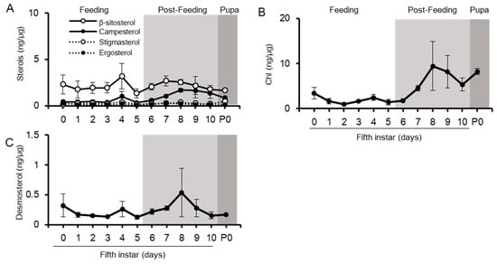 Changes in sterol amounts in the midgut from final instar to pupal periods. The amount of dietary sterols (A), Chl (B), and desmosterol (C) was quantified using LC-MS/MS and standardized using the protein amounts of the respective samples. Values are mean ± s.d. (n = 3). P0: pupal stage day 0.