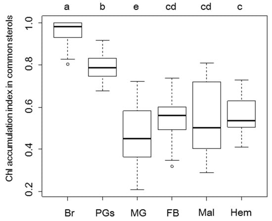 Comparison of Chl proportion to the amount of common sterols in silkworm tissues and the hemolymph. Dietary sterols (β-sitosterol, campesterol, stigmasterol, and ergosterol), desmosterol, and Chl were detected in most tissues and hemolymph. Chl accumulation index in common sterols showed the Chl proportion compared to common sterols. The data in this figure are the same set as in Figure 2, Figure 4, Figure 5 and Figures S6 and S7. The statistical significance of differences was determined by one-way analysis of variance (ANOVA) followed by Tukey-Kramer’s test. Br: brain, PGs: prothoracic gland, MG: midgut, FB: fat body, Mal: Malpighian tubules, Hem: hemolymph.