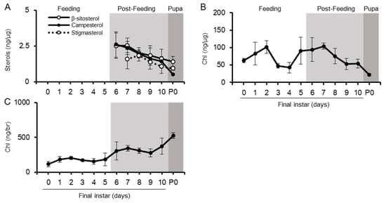 Changes in sterol amount in the brain from final instar to pupal periods. The amount of dietary sterols normalized by protein amounts (A), the amount of Chl normalized by protein amounts (B), and Chl amounts in a single brain (C). Values are mean ± s.d. (n = 3). P0: pupal stage day 0.