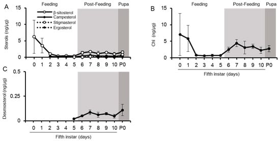 Changes in sterol concentrations in the hemolymph from final instar to pupal periods. The concentrations of dietary sterols (A), Chl (B), and desmosterol (C) were quantified. Values are mean ± s.d. (n = 3). P0: pupal stage day 0.