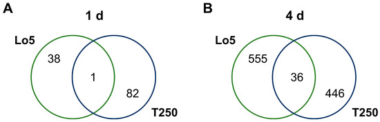 Shared and specific transcripts modulated during the growth without N. (A) Shared and specific transcripts modulated between Lo5 and T250 at 1 d. (B) Shared and specific transcripts modulated between Lo5 and T250 at 4 d.