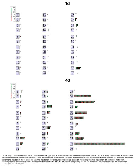 Overview of transcripts specifically modulated in Lo5 roots at 1 d and 4 d according to MapMan bincode classification. Log2(ratio) is shown by the color scale (green indicates a decrease and red an increase in transcript abundance in the comparisons 1 d vs. 0 d and 4 d vs. 0 d). Colored square: modulate transcript; gray circle: category without modulated transcripts.