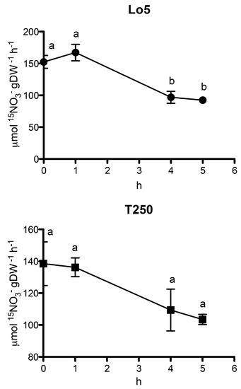 The transcriptional differences between Lo5 and T250 observed for transcripts involved in NO3− and NH4+ transport during the growth without N are in line with the rate of 15NH4+ and 15NO3− uptake determined at 0, 1, 4 and 5 d for both inbred lines (Figure 4 and Figure 5). The growth without N positively and negatively affected the uptakes rates of NH4+ and NO3−, respectively. Anyway, the differences are statistically significant only for the high NUE line, Lo5. In particular, in this line, the uptake rate of the cation peaked at 4 days of N starvation (Figure 4). This behavior agrees with the upregulation of the transcript for a high affinity NH4+ transporter, ZmAMT3.3, that was observed at 4 d only in this inbred line thus suggesting its possible involvement in the uptake process (Tables S1 and S3). NH4+ uptake rate trend is in line with previously results reported in roots of maize plants subjected to N starvation even though accompanied by a reduction of the expression of ZmAMT1.1a and ZmAMT1.3, the only two genes whose expression was analyzed [56]. A recent transcriptional analysis carried out in B73 maize roots [35] indicated the ZmAMT1.1A, ZmAMT2.1 and ZmAMT3.2 as genes modulated by N starvation. The results here obtained on the expression of the NH4+ transporter genes—that are also supported by the changes in NH4+ uptake rate—suggest that the effect of N starvation on NH4+ transport phenomena is strongly dependent on the genotypes and/or the experimental conditions.