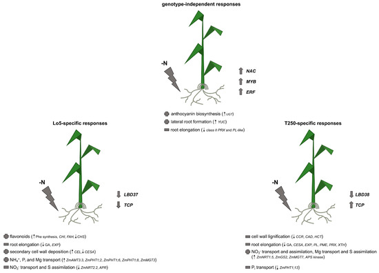 Schematic representation of genotype-independent and Lo5- and T250-specific root responses to the growth without N. Abbreviations: AMT1, AMMONIUM TRANSPORTER/METHYLAMMONIUM PERMEASE/RHESUS (AMT/MEP/RH) 1; APS KINASE, ADENOSINE 5′-PHOSPHOSULFATE KINASE; APR, ADENOSINE 5′-PHOSPHOSULFATE REDUCTASE; CAD, CINNAMYL ALCOHOL DEHYDROGENASE; CCR, CINNAMOYL-CoA REDUCTASE; CEL, CELLULASE; CESA, CELLULOSE SYNTHASE; CHI, CHALCONE-FLAVONE ISOMERASE; CHS, CHALCONE SYNTHASE; ERF, ETHYLENE RESPONSIVE ELEMENT BINDING FACTOR; EXP, EXPANSIN; FAH, FERULIC ACID 5-HYDROXYLASE; GA, GIBBERELLIN; GS2, GLUTAMINE SYNTHETASE; HCT, HYDROXYCINNAMOYL-COENZYME A SHIKIMATE/QUINATE HYDROXYCINNAMOYLTRANSFERASE; LDB, LOB DOMAIN-CONTAINING PROTEIN; NAC, NO APICAL MERISTEM (NAM), ARABIDOPSIS TRANSCRIPTION ACTIVATION FACTOR (ATAF), CUP-SHAPED COTYLEDON (CUC); MGT, MAGNESIUM TRANSPORTER; NRT1, NITRATE TRANSPORTER 1; NRT2, NITRATE TRANSPORTER 2; Phe, phenylalanine; PHT1, PHOSPHATE TRANSPORTER 1; PL, PECTATE LYASE; PL-like, PECTIN LYASE-like; PME, PECTIN METHYLESTERASE; PRX, PEROXIDASE; TCP, TEOSINTE BRANCHED1/CYCLOIDEA/PROLIFERATING CELL FACTOR; XTH, XYLOGLUCAN ENDOTRANSGLYCOSYLASE/HYDROLASE; UGT, UDP-GLUCOSYL TRANSFERASE; YUC, FLAVIN MONOOXYGENASE-LIKE. Top arrow: positive modulation; down arrow: negative modulation.