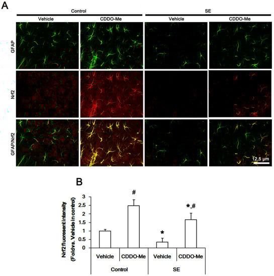 2.5. CDDO-Me Mitigates SE-Induced Astroglial Loss by Enhancing Nrf2 Expression