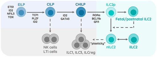 Development of ILC2. This scheme demonstrates the subdivision of the ILC2 lineage into oligo-potent precursors (Blue), non-ILC2 lineages (Grey), and the ILC2 lineage (Green). The Early Innate Lymphocyte Precursor (EILP) expresses ETS1, ID2, NFIL3, TOX, and differentiates into the Common Innate Lymphocyte Precursor through the expression of TCF1 and PLZF. These precursors give rise to NK cells, LTi cells (dashed arrow) and the Common Helper Innate Lymphocyte Precursor (CHILP). ID2 and GATA3-dependent CHILP lose the potential to generate NK cells and LTi cells while retaining the ability to generate ILC1, ILC3, and ILCreg (dashed arrow). Upregulation of RORa, BCL11b, and GFI1 within CHILP restrict the development of ILC2 progenitors that differentiate into fetal/postnatal ILC2 and adult/natural ILC2. Fetal/postnatal ILC2 may differentiate into natural ILC2 (dashed arrow). Natural ILC2s differentiate into inflammatory ILC2 under circumstance of tissue perturbation and respond to environmentally-induced signal by destabilizing their ILC2 phenotype and adapting ILC1/ILC3 effector functions possibly termed ‘plasticity’ (dashed arrow).