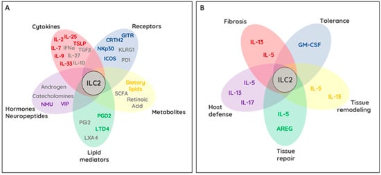 Regulation of ILC2 functions and ILC2-dependent control of host tissues. Schemes demonstrate in (A) molecules and receptors involved in ILC2 activation (colored) and ILC2 inhibition (grey). Bubbles within the Venn-diagram like schemes represent subclasses of activating and inhibiting molecules (Cytokines—red; non-cytokine, surface receptor—blue; dietary metabolites— yellow; lipid mediators—green; neuropeptides and hormones—violet). Overlaying bubbles indicate possible synergistic and antagonistic actions of these molecules that in sum positively and negatively regulate ILC2 activation. Scheme (B) demonstrates the effects of ILC2 activation on tissues and immunity. Selective cytokines and cytokine groups are indicated. Tissue remodeling, tissue repair, host defense, fibrosis, as well as immune and disease tolerance require selective and context dependent actions of IL-5, IL-13, IL-17, AREG, and GM-CSF. Overlap between individual bubbles within the Venn-diagram further suggest possible transitions between tissue-regulatory effects by ILC2.