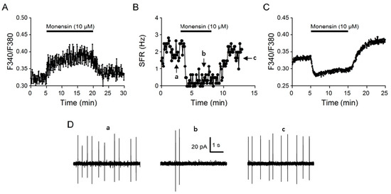 To investigate the role of intracellular Na+ in regulating [Ca2+]i, we first determined the effects of the Na+ ionophore monensin on [Ca2+]i in the SCN neurons. In our previous studies, monensin at a concentration of 10 µM increases [Na+]i and activates Na+/K+-ATPase (NKA) to hyperpolarize the resting membrane potential [17], and at a concentration of 1 µM also increases [Na+]i to allow for Ca2+ uptake via Na+/Ca2+ exchanger (NCX) in response to the removal of external Na+ [10]. Figure 1 shows three representative experiments to demonstrate the effect of 10 µM monensin on [Na+]i, spontaneous firing, and [Ca2+]i. The addition of 10 µM monensin increased [Na+]i (Figure 1A) and inhibited spontaneous firing (Figure 1B,D), confirming our previous finding that 10 µM monensin increases [Na+]i and activates NKA to hyperpolarize the resting membrane potential [17]. Monensin also lowered basal [Ca2+]i (Figure 1C), apparently as a result of membrane hyperpolarization and firing inhibition.