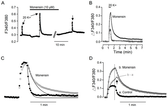 Contrary to its suppressive effect on basal [Ca2+]i, 10 µM monensin markedly enhanced the Ca2+ response to the application of 20 mM K+ solution, as exemplified by the result obtained from a representative experiment (Figure 2A). Superimposition of the Ca2+ response to 20 mM K+ before (dark trace), during (open circle trace), and after (grey trace) the application of 10 µM monensin indicates that 10 µM monensin reversibly increased the amplitude of Ca2+ transient and slowed the rate of Ca2+ clearance following the termination of 20 mM K+ stimulation (Figure 2B). Monensin also slowed the rate of Ca2+ rise. This can be seen by superimposing the normalized Ca2+ transients to compare their kinetics in the absence (filled circles) and presence (open circles) of monensin (Figure 2C). Note the slower rate of Ca2+ rise, without reaching a steady state during the 20 s stimulation, for the Ca2+ transient in monensin (open circles; Figure 2C,D).