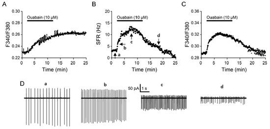 We previously reported that NKA potently controls excitability and [Na+]i in the SCN neurons [17,19]. The ability of Na+ loading by 10 µM monensin to inhibit forward NCX activity suggests that NKA, by regulating [Na+]i, could play an important role in the regulation of NCX activity. For comparison with the effects of monensin, ouabain at a concentration of 10 µM was also applied to determine its effects on [Na+]i, spontaneous firing, and [Ca2+]i (Figure 3). As expected, 10 µM ouabain increases [Na+]i (Figure 3A), spontaneous firing (Figure 3B), as well as [Ca2+]i (Figure 3C), a result consistent with our previous findings of using K+-free solution to inhibit NKA [10,17,19].