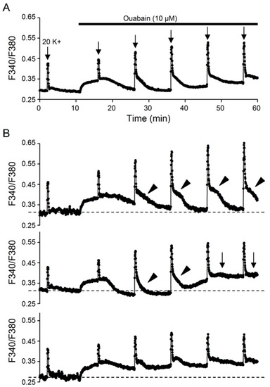 Figure 4A shows the average Ca2+ response (18 cells) to 20 mM K+ in the absence and presence of 10 µM ouabain to demonstrate the appearance of prominent slow decay phase in parallel to the decrease of basal level of [Ca2+]i back to or even below the resting level, following an initial increase by ouabain. Figure 4B shows three different patterns of Ca2+ response in ouabain from three representative cells. For the first cell (top), after an initial increase in ouabain the basal level of [Ca2+]i returned to near its resting level for as long as 30 min along with the appearance of prominent slow decay phase (marked by arrowheads) for the 20 K+-evoked Ca2+ transients. For the second cell (middle), after an initial increase in ouabain the basal [Ca2+]i return to near its resting level for about 10 min only to increase back to a level similar to or higher than the initial increase by ouabain. Notably, the slow decay phase for the Ca2+ transient appeared (marked by arrowheads) when the basal [Ca2+]i decreased back to close to the resting level and then disappeared (marked by arrows) altogether when the basal [Ca2+]i increased again to the higher levels. For the third cell (bottom), there is only a small decrease in basal [Ca2+]i following ouabain-induced initial increase and so is only a small increase in the slow decay phase.