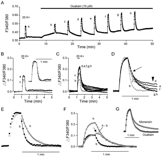 Of note, the Ca2+ transients evoked after ~15 min into 10 µM ouabain have virtually identical fast decay but widely varied slow decay phase, suggesting that the slow decay phase as observed in ouabain is not associated to the fast decay mediated by Ca2+ extrusion via NCX, the activity of which depends on both extracellular [10] and intracellular (this study) Na+. Furthermore, the magnitude of the slow decay appears to be associated with the levels of [Ca2+]i when Ca2+ transient was elicited by 20 mM K+. This is evident by comparing trace d with trace f (Figure 5A), showing that trace d having lowest basal [Ca2+]i before stimulation but largest amplitude of slow decay, whereas trace f having highest basal [Ca2+]i with virtually no slow decay. In other words, there appears to be a negative correlation between basal [Ca2+]i and the magnitude of the slow decay phase. This is best exemplified in a different experiment, in which Ca2+ transients were elicited with longer inter-application interval to allow for better visualization of the slow decay phase (Figure 4).