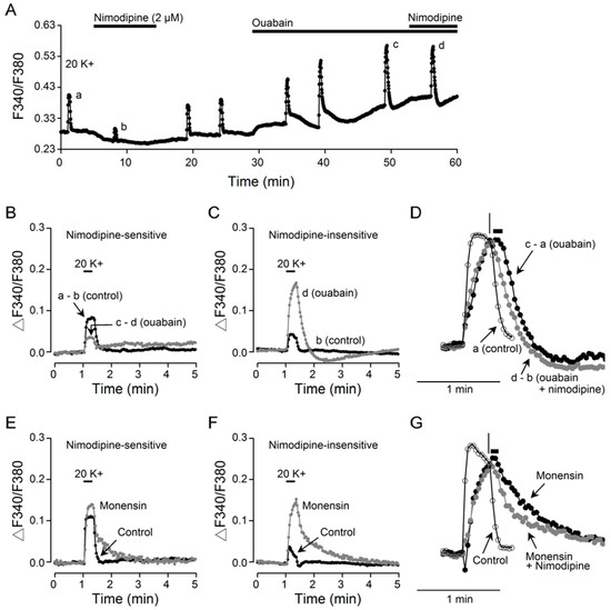 Preferential enhancement by ouabain of nimodipine-insensitive Ca2+ transients. (A) a representative experiment showing the effect of 2 µM nimodipine on 20 K+-induced Ca2+ response (an average of 13 cells) in the absence and then presence of 10 µM ouabain. (B,C) Superimposition of Ca2+ transients showing that ouabain inhibits nimodipine-sensitive (B) but enhances the nimodipine-insensitive (C) Ca2+ transients. (D) Normalized Ca2+ transients to show the delayed onset of Ca2+ clearance (marked by horizontal bar) for ouabain-enhanced Ca2+ transient in the absence (c – a) but not in the presence (d – b) of nimodipine. The control Ca2+ transient (a) was also shown to indicate the rapid Ca2+ decay (marked by vertical line) on termination of 20 mM K+ stimulation. (E,F) Superimposition of Ca2+ transients showing that monensin enhances both nimodipine-sensitive (E) and -insensitive (F) Ca2+ transients. (G) Normalized Ca2+ transients to show the effect of nimodipine on the delayed onset of Ca2+ clearance (marked by horizontal bar). The control Ca2+ transient was also shown to indicate the rapid Ca2+ decay (marked by vertical line) on termination of 20 mM K+ stimulation.