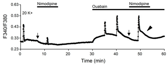 Although nimodipine-sensitive Ca2+ influx appears to participate in the generation of the delayed onset of Ca2+ clearance, it is not required for the plateau-like slow decay phase in ouabain. For the experiment, nimodipine was applied when ouabain-induced increase in the basal [Ca2+]i began to decrease back to near resting levels as exemplified in a representative experiment shown in Figure 7. As indicated, the application of nimodipine (marked by arrow) did not prevent the occurrence of plateau-like slow decay (marked by arrowhead), suggesting that the plateau-like slow decay does not depend on nimodipine-sensitive Ca2+ influx.