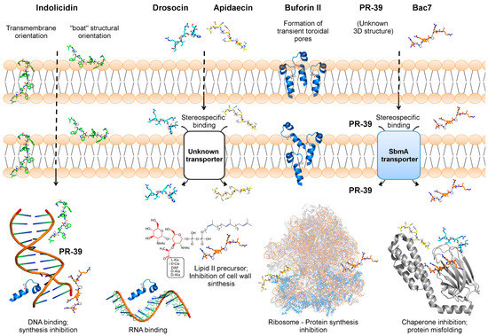 Here we summarize the main molecular mechanisms by which non-lytic AMPs translocate across membranes. These mechanisms involve different AMP arrangements (e.g., “boat-like” and transmembrane orientations, for indolicidin) [28] and the formation of transient toroidal pores, which facilitates non-lytic AMPs (e.g., buforin II) in crossing both the bacterial OM and IM to act on intracellular targets [84]. In addition, the stereospecific binding of AMPs to IM transporters (e.g., apidaecin, bac7, and PR-39) has also been highlighted as a strategy by which these peptides reach the bacterial cytosol to exert their functions [37,78]. These mechanisms have also been reported for another non-lytic AMP, called pyrrhocoricin, which is derived from the European firebug Pyrrhocoris apterus. As for bac7, apidaecin, and drosocin, pyrrhocoricin binds stereospecifically to an IM target protein and further enters the cytosol to inhibit chaperone-assisted protein folding by interacting with the molecular chaperone DnaK [115]. Similar findings have been reported for oncocin, a proline-rich AMP derived from the milkweed bug, Oncopeltus fasciatus [116].